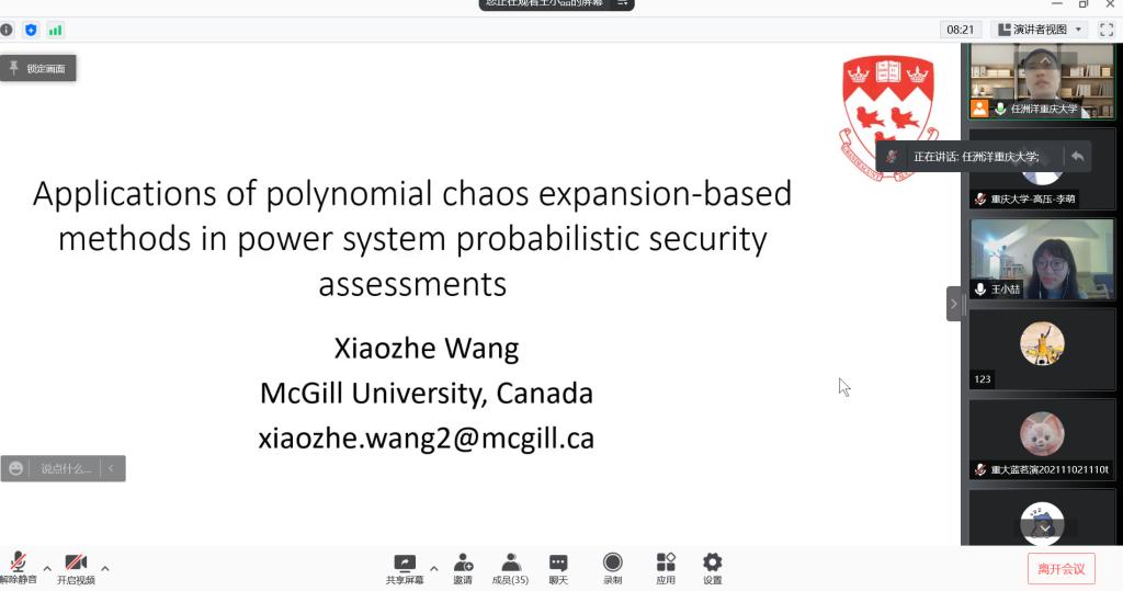 2021年12月11日上午,加拿大麦吉尔大学电子与计算机工程系助理教授王小喆受邀做客“成渝地区双城经济圈智慧能源大讲坛”,担任讲坛第六期的主讲嘉宾,以“Applications of Polynomial Chaos Expansion-based Methods in Power System Probabilistic Security Assessments”为主题开讲。本期讲坛由黄色动漫 、输配电装备及系统安全与新技术国家重点实验室和黄色动漫 溧阳智慧城市研究院主办,由成都地区的四川大学、电子科技大学...