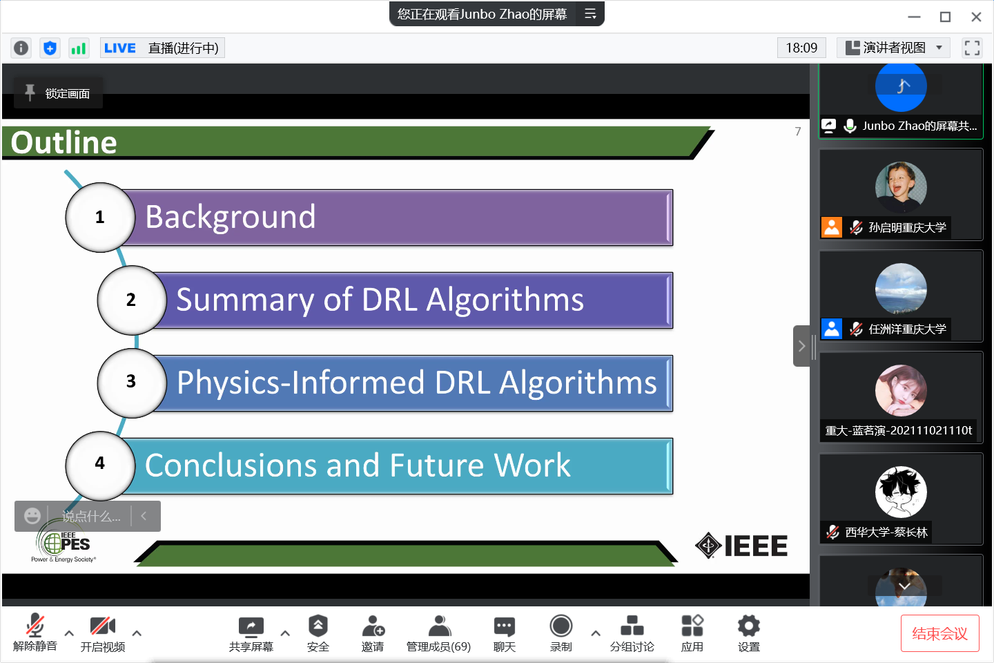 2022年4月24日上午,美国康涅狄格大学电气与计算机工程学院助理教授赵俊博受邀做客“成渝地区双城经济圈智慧能源大讲坛”,担任第十期主讲嘉宾,以“Physics-Informed Deep Reinforcement Learning for Power System Optimization and Control”为主题开讲。本期讲坛由黄色动漫 、输配电装备及系统安全与新技术国家重点实验室和黄色动漫 溧阳智慧城市研究院主办,由成都地区的四川大学、电子科技大学、西南交通大学、成都理工大...