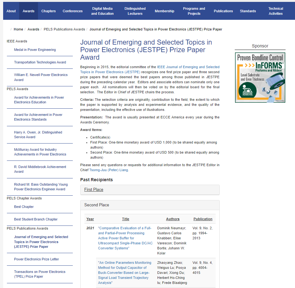 近日,国际电气电子工程师协会(Institute of Electrical and Electronics Engineers——IEEE)电力电子学会(Power Electronics Society——PELS)公布了旗下期刊IEEE Journal of Emerging and Selected Topics in Power Electronics (IEEE JESTPE) 2021年度最佳论文奖(Prize Paper Awards)获奖名单。从该刊2021年度出版的601篇论文中,评选出一等奖论文1篇、二等奖论文3篇。IEEE电力电子学会论文获奖信息官网网站链接:http...
