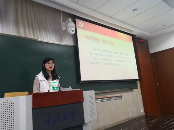 接着,陈美青同志以脱贫攻坚为主题,通过介绍“羊”书记隋耀达以“一种一养一锦一网的”的“四个一”项目带领加茂镇共村脱贫致富的优秀事迹,让支部成员们深刻体会到奋战在全国脱贫攻坚第一线的驻村第一书记作为一名党员干部的古道热肠和使命担当。最后,陈美青同志介绍了已逝世好党员黄文秀作为扶贫路上女战士的榜样事迹,借其事迹阐述了何为“用美好青春诠释共产党人的初心使命,谱写新时代的青春之歌”,以鼓励支部成员们将优秀党员同志作为榜样,不断提升自身能力,不忘初心,坚持为人民服务!