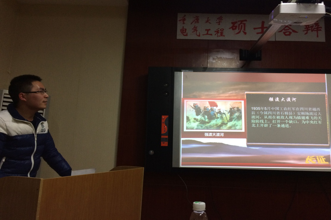 活动首先由张文龙同志进行了关于中国工农红军长征的PPT讲解。回顾了长征的背景、路线,并着重介绍了长征中飞夺泸定桥、四渡赤水等著名历史事件。今年是红军长征胜利80周年,80年前中国共产党领导中国工农红军转战大半个中国,一路浴血奋战,舍生忘死,胜利完成举世闻名的二万五千里长征,创造了人类历史上无与伦比的革命壮举。这个伟大壮举将永远铭刻在中国革命和中华民族的史册上。