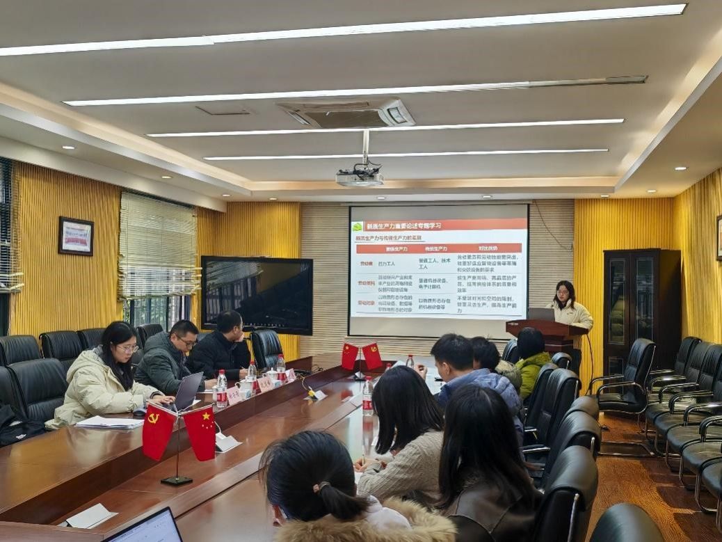 本次主题党日活动共分为3个环节。首先,博士生五支部陈丹同志带领大家学习了习近平总书记关于发展新质生产力的重要论述、新质生产力的基本内涵,并通过学习人民日报社经济宣传融媒体品牌栏目“高质量发展故事汇”中“新质生产力,如何在实践中成长?”视频资料,提升党员同志们对“新质生产力”的理解。