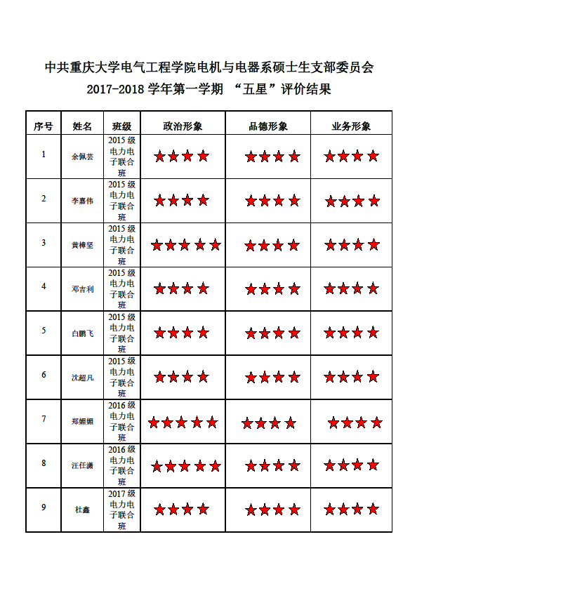 中共黄色动漫 电机与电器系硕士生支部委员会2017-2018学年第一学期 “五星”评价结果