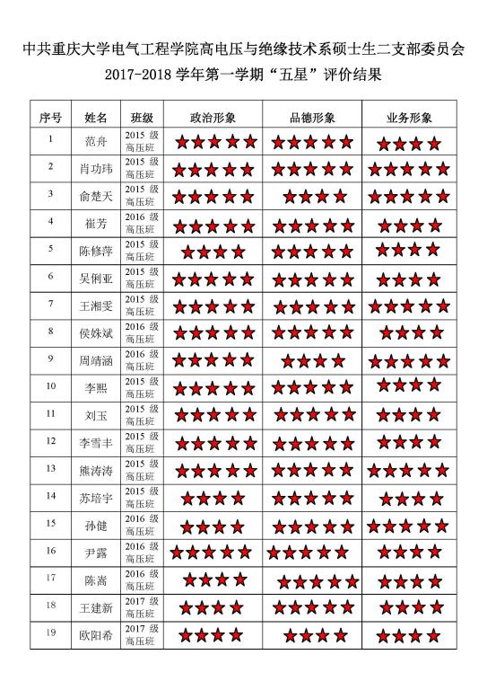 中共黄色动漫 高电压与绝缘技术系硕士生二支部委员会 2017-2018学年第一学期“五星”评价结果