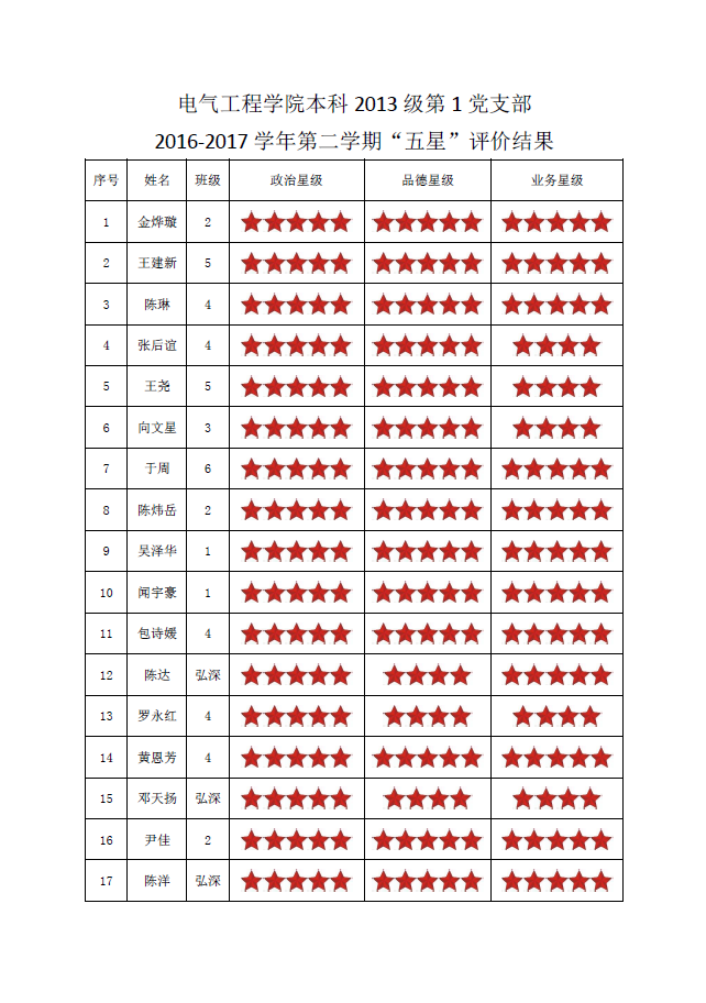 本科2013级第2党支部2016-2017学年第二学期五星评价结果