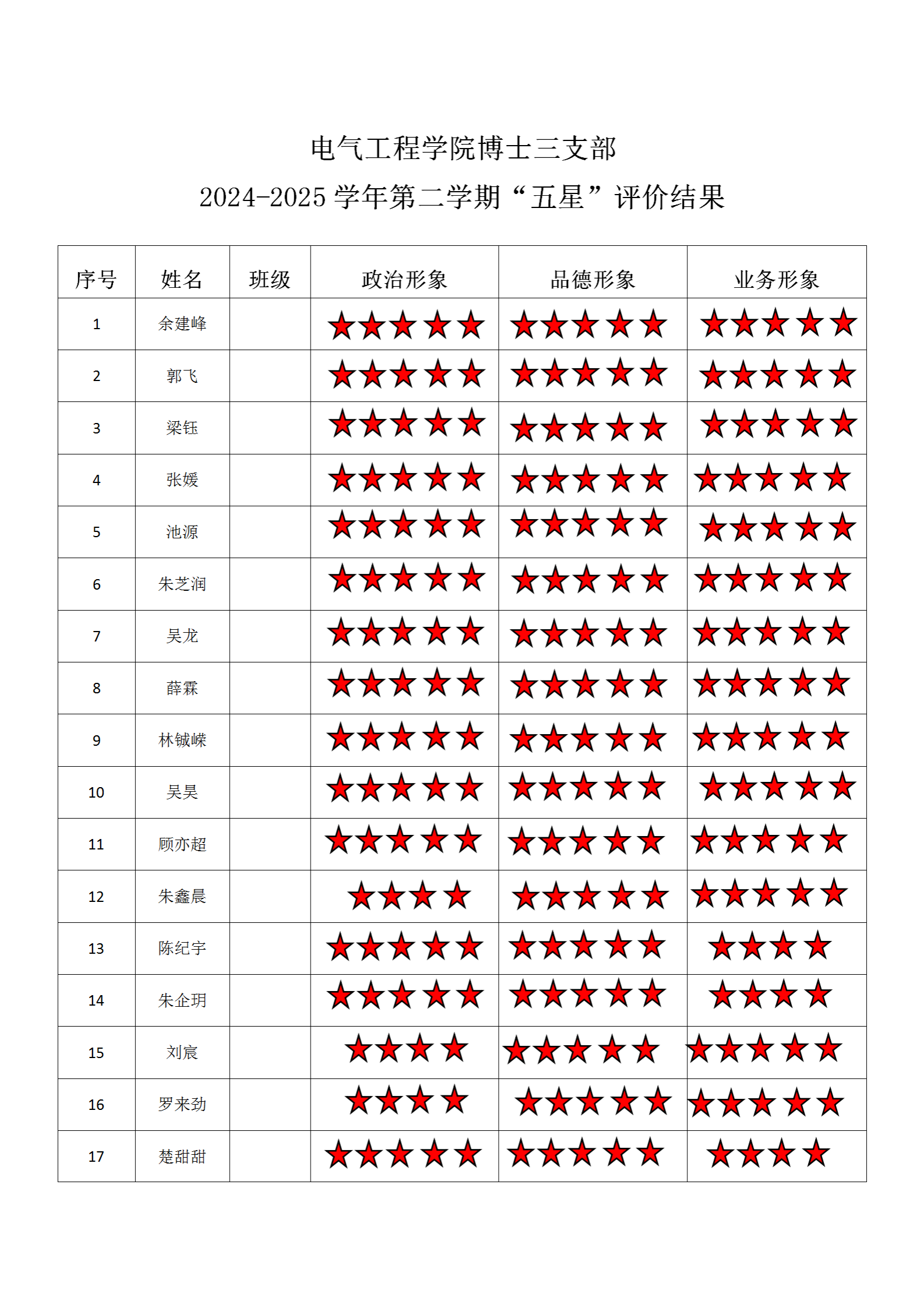 黄色动漫 博士二支部 2024-2025学年第二学期“五星”评价结果