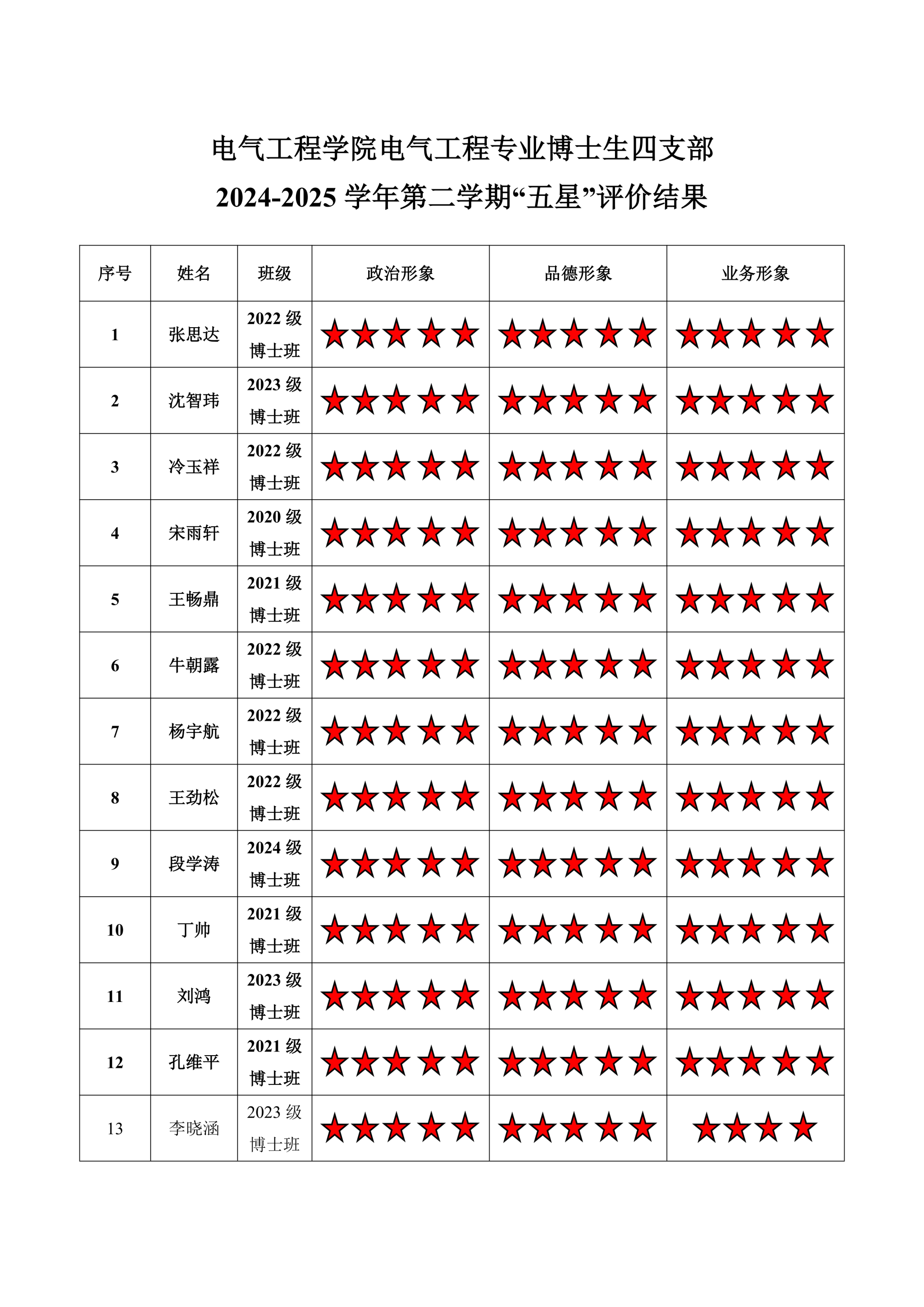 黄色动漫 博士四支部 2024-2025学年第二学期“五星”评价结果
