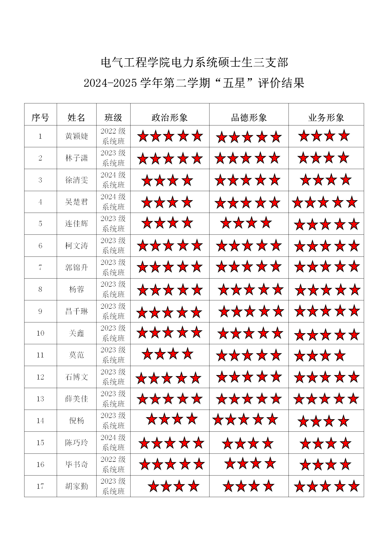 黄色动漫 系统二支部 2024-2025学年第二学期“五星”评价结果