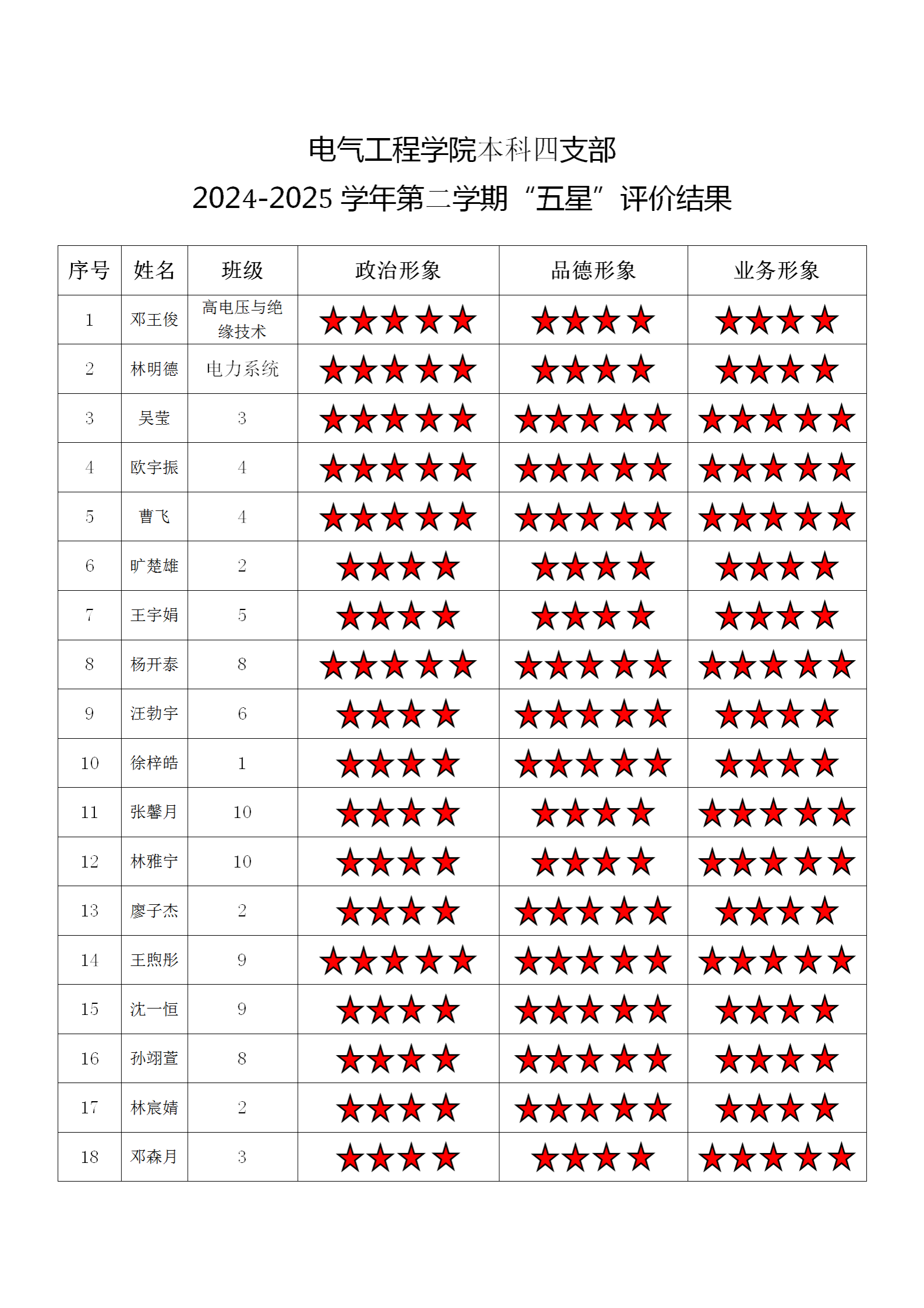 黄色动漫 本科生四支部 2024-2025学年第二学期“五星”评价结果