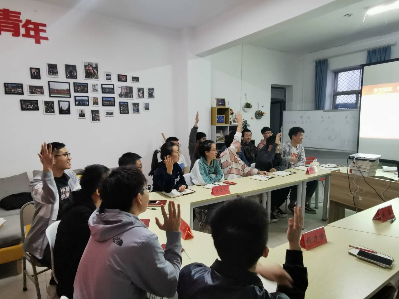 接着,为更加深入地学习党史、新中国史、改革开放史、社会主义发展史,支部组织开展党史知识竞赛。党史知识竞赛分为三个环节:分组答题、小组抢答、风险答题。在各个环节中,党员同志们你追我赶,精诚合作,集思广益,为团队贡献智慧和力量,营造了浓厚的学史氛围,展现了当代大学生的青春风采。经过激烈的角逐,第二小组遥遥领先,夺得头筹。