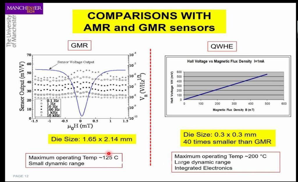 与现阶段基于巨磁阻效应(GMR)的常规磁传感器相比,量子阱霍尔传感器可以做到0.3mm×0.3mm,体积较GMR芯片更小,更容易实现阵列化设计,从而实现更优的动态范围和分辨率。