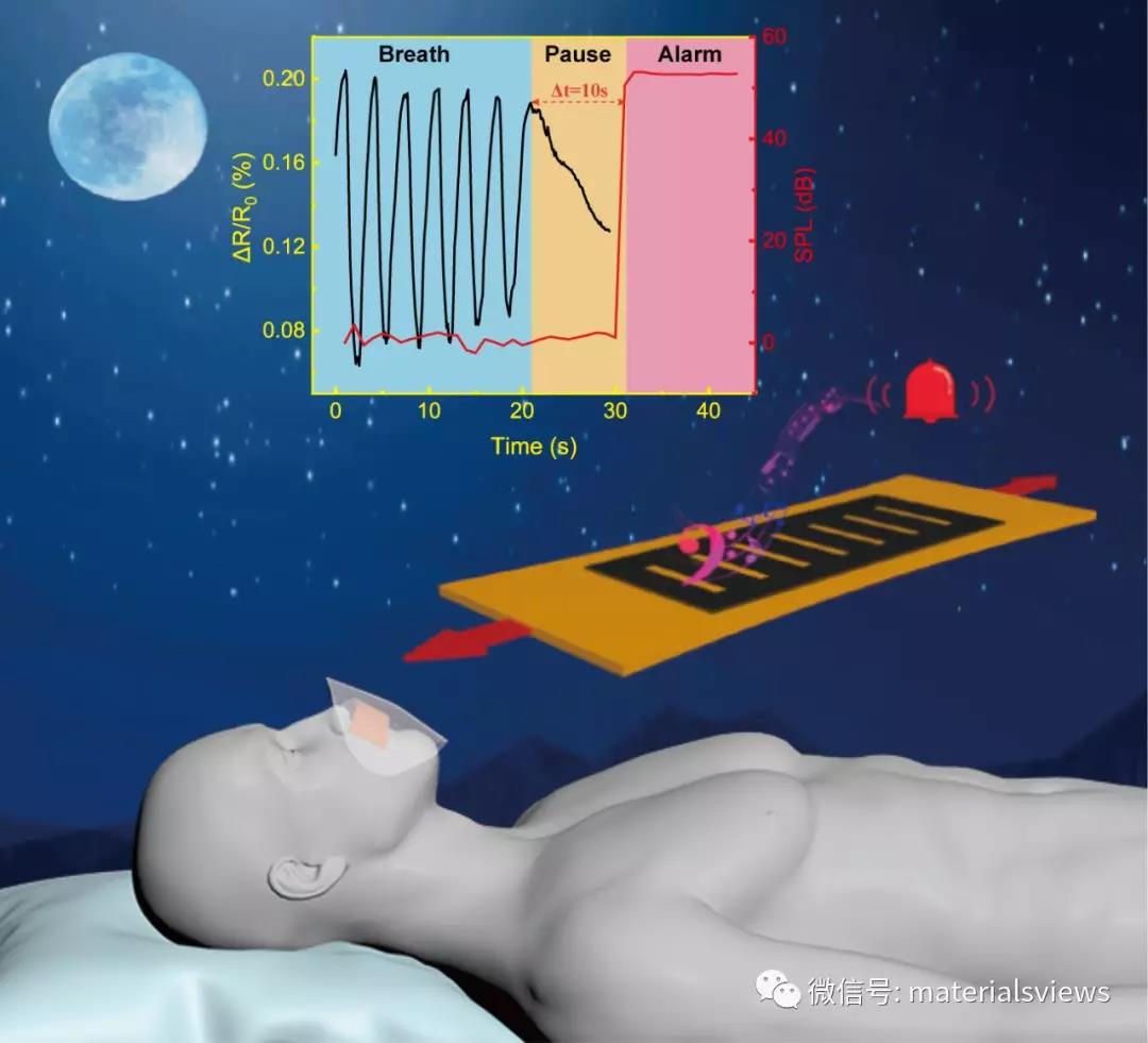 纳米材料(石墨烯、碳纳米管、纳米线等)的出现大大推动了可穿戴健康设备的发展,并广泛应用于呼吸、脉搏、心率等多种健康信号的监测识别。但大多数可穿戴设备主要根据电阻或电容等电学信号变化来实现机械应力的检测,而缺乏了自主发声报警功能,因此开发一种集成检测和报警于一体的电子皮肤器件,是一项具有启发性和挑战性的研究工作。