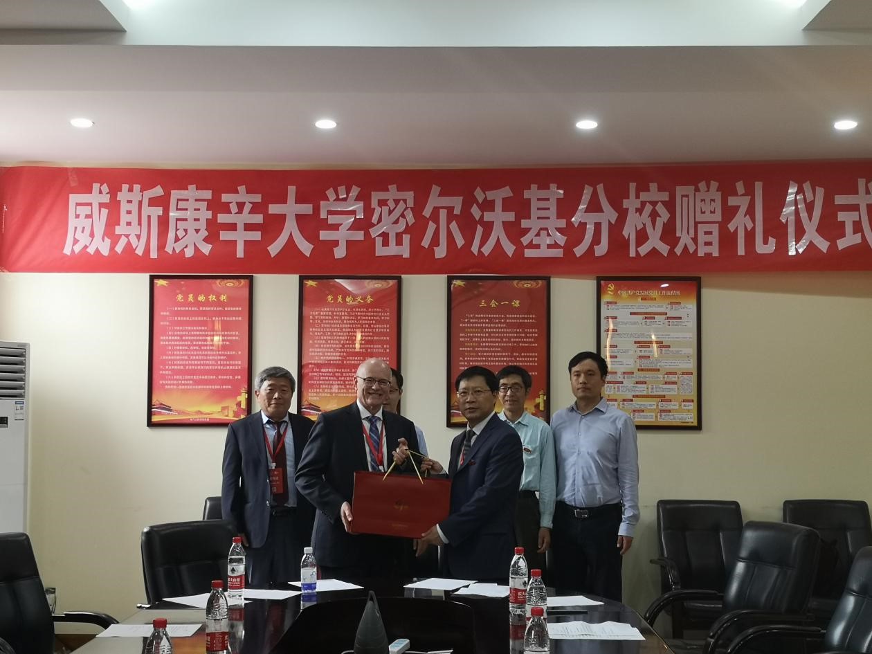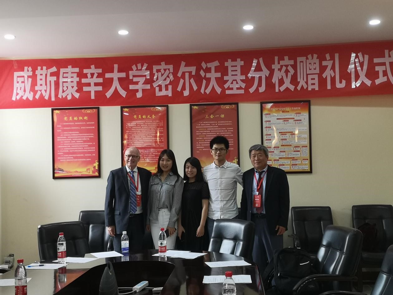 赠礼仪式开始前,来自威斯康辛大学密尔沃基分校的两位教授向我们介绍了两校多年来合作办学项目的具体事项以及近些年取得成果,并鼓励同学们积极参加联合办学项目。