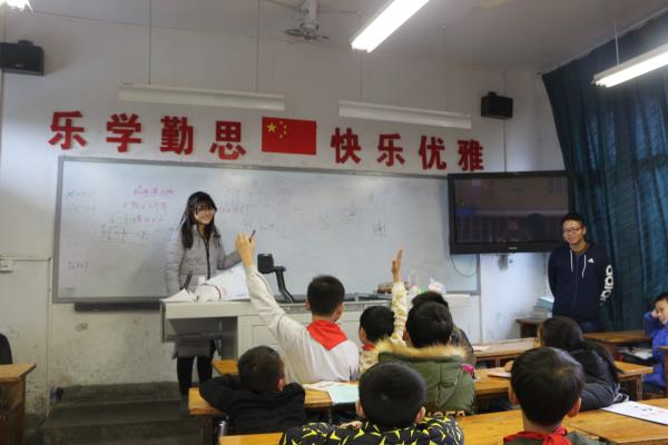 接着,志愿者们开始本次的授课。首先,志愿者带来的是浮起来的鸡蛋实验。鸡蛋放进装水的杯子里会沉下去,这是同学们都说对了的。接着,志愿者向水中加入盐,鸡蛋浮了起来,同学们都惊奇不已,十分好奇其中的原理。通过志愿者们的讲解,同学们初步理解了密度的概念,在类比之下,同学们也明白了喝汤时油浮在水上,而不是沉入水中的原因。