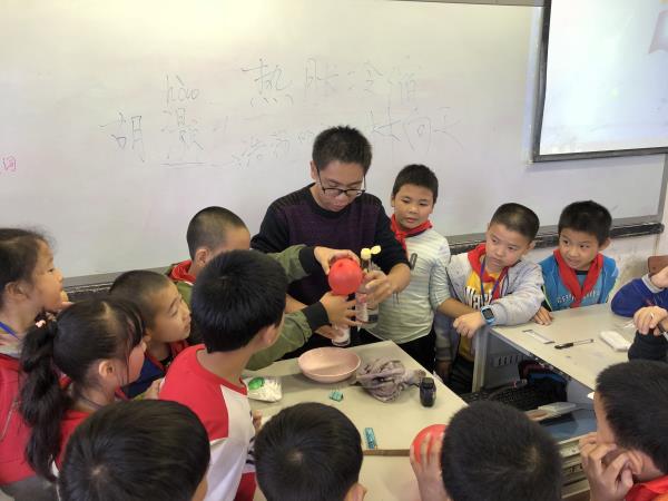 20171026日下午,黄色动漫 的9名志愿者,在电气青协指导中心四名干事李轲、李依笑、郭殊航和郑钦仁的带领下分别前往璧山保家小学和大路小学开展科技支教活动。此次是本学期的第三节科技支教课程,志愿者们特地为孩子们准备了“水往高处爬”、“神奇巫师的特饮”、“熄灭的蜡烛”“会吸气球的杯子”等趣味小实验,并用PPT进行了丰富细致的讲解。孩子们在动手的欢乐中,学习到了毛细作用、二氧化碳的阻燃作用、热胀冷缩等知识。