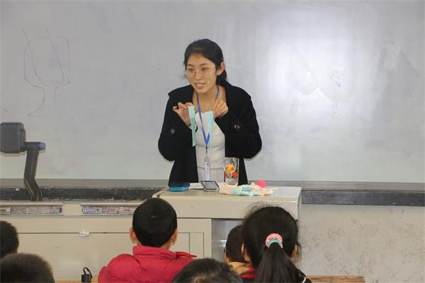在保家小学,课堂伊始,志愿者以“会跳远的乒乓球”实验作为引入,为孩子们介绍了大气压强的科学概念。只见志愿者对高脚杯内的乒乓球轻吹一口气,乒乓球便在孩子们惊奇的注视下一个高跳飞出了杯子。被调动起学习兴趣的孩子们迫不及待地在志愿者们的指导下开始了自己的尝试。通过亲身试验,孩子们发现吹气的角度不同会对乒乓球的运动产生不同的影响,大家对这种现象很疑惑。志愿者们抓住了孩子们的好奇心理,接着进行了“会飞的吸管”、“手绢的秘密”等实验,带领孩子们充分体会了压强的魅力后,对实验原理进行了图文并茂地讲解。