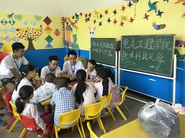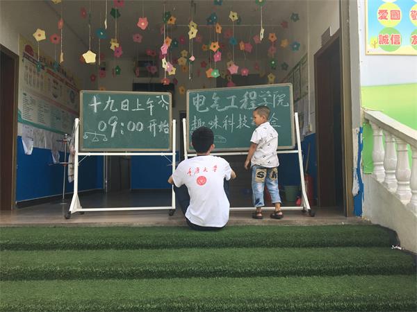 在当地村委会帮助召集留守儿童的同时,志愿者们还利用幼儿园教室中的移动小黑板制作了“趣味科技实验”的宣传黑板报。“电气工程”和“趣味科技”等字眼,加上手绘的飞机和天平图案,黑板报很快引起了附近孩子们的兴趣。一名小学一年级的男孩甚至直接跑到了志愿者身边提问:“老师,你要带我们做什么实验啊?我从来没做过实验。”面对小男孩好奇的目光,志愿者索性就地坐下,和他肩并肩,开始耐心地介绍本次的科技支教课程。两人温馨的互动很快吸引了更多的小朋友参与到讨论之中。