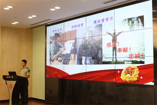 来自机械工程学院的国防生代表陈林以汶川地震为切入点,讲述了他如何一步步成长为拥有坚韧品格的追梦人、肩负正能量的传播者、集体利益的守卫者。最后他号召国防生们坚定理想信念,做好强军路上的排头兵。