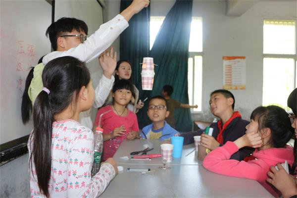本次支教在保家小学和大路小学同时进行。本周实验关于气体热力学,首先志愿者们用加热的塑料杯吸起膨胀气球的趣味小实验,为孩子们建立气压的概念,了解气体受热膨胀气压的变化。孩子们因此想到了孔明灯,志愿者们讲解了孔明灯的制作方法,希望孩子们有条件可以尝试,但须注意安全。接着,以前面实验为基础,志愿者们开始另一个实验“瓶子吹泡泡”。用热水浇淋塑料瓶,瓶内气体膨胀使之连接瓶子的吸管吐出一个个泡泡。孩子们对之十分感兴趣,并且他们还发现当瓶子冷却后,水被吸到了瓶中。这让他们联系讲的知识,猜出这是因为气体冷却气压变小而产生力的作用。 最后,志愿者们带来了本次最精彩的实验“纸杯旋转灯”,志愿者们邀请小朋友参与到实验中来,小朋友们积极参加,最后,在他们的共同努力下,纸杯旋转灯做成功了,孩子们亦感到成功的喜悦。在孩子们的欢声笑语中,本次支教画上了圆满的句号。