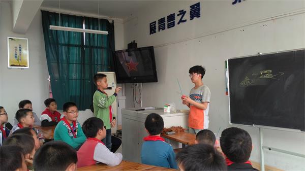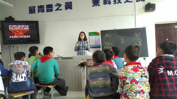 与此同时,大路小学支教活动也在如火如荼地开展。志愿者们如往常一样进行了自我介绍,在孩子们的期待中开始了本期的科技课堂。志愿者先在黑板上画出了玩具弹簧枪的模型图,并向孩子们提问弹簧枪的原理。孩子们热情高涨,很快就有孩子站起来主动回答问题。在讲解完了弹簧枪的原理后,志者们开始讲解的主题——“弹性势能”并开始今天的第一个实验—“飞的更高的吸管”。伴随孩子们的阵阵惊呼,吸管真的飞的更高了。为了让孩子们可以亲身体会到实验,志愿者们让孩子们分组进行实验,然后向孩子们提问原理,借着刚才玩具弹簧枪的启发,很快就有孩子主动站起来回答问题。进行了实验以后,本学期支教的力学知识就讲完了。志愿者们精心挑选了力学部分的经典实验,为孩子们回顾了力学知识——张力、作用力与反作用力、浮力、压强等知识。在小结的最后,志愿者们播放了一段精心准备的实验片段,让孩子们更加深刻地记忆下了所学习到的知识。结束了力学知识,志愿者们又开始了光学知识的介绍。志愿者们先用“光有颜色吗?是否见过彩虹?”等问题来启发孩子。然后开始了光学第一个实验—“光的直线传播”,并且举例树阴中的阳光来联系生活,让孩子们很快理解了“光沿直线传播”这一个概念。一个小时的课堂很快就结束了,在孩子们意犹未尽的眼神中,我们结束了本期的课堂。