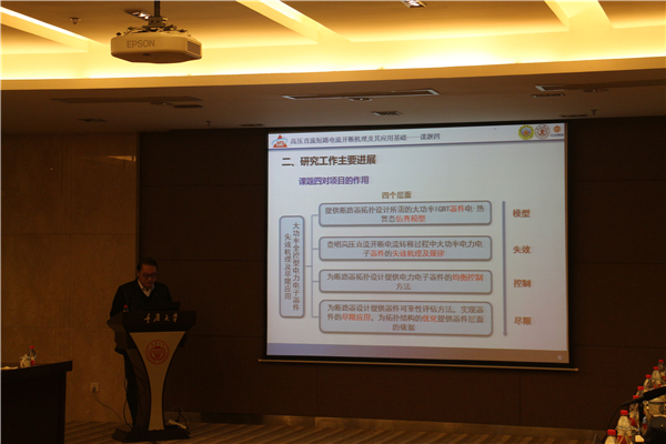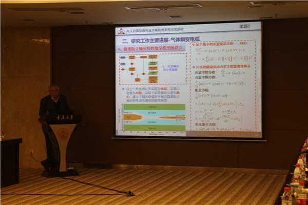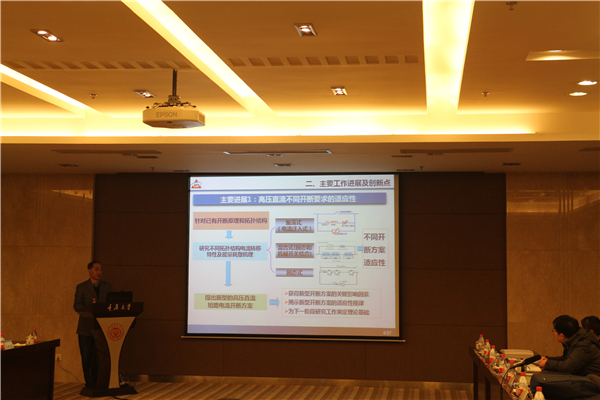 荣命哲教授介绍了项目的总体研究进展,汇报了本年度在高压直流断路器新型拓扑结构、直流瞬变电弧等方面取得的创新成果,分析了项目5个课题的计划与执行情况,2016年度各项指标均完成了计划要求。