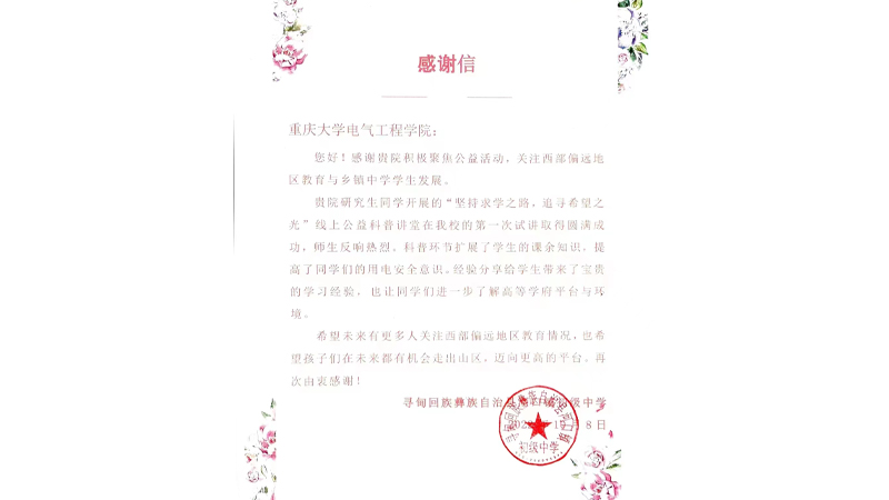 收到一封来自云南寻甸回族彝族自治县河口镇初级中学的感谢信。信中对黄色动漫