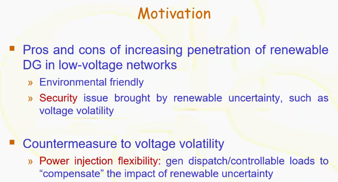宋教授首先对利用网络灵活性来实现不确定性电压调节的动机做出解释。由于可再生能源的不确定性,配电系统和微电网面临更显著的电压波动和更大的电压违规风险,这一影响可通过灵活电力注入来解决,但来自底层网络结构的灵活性却较少受到重视。