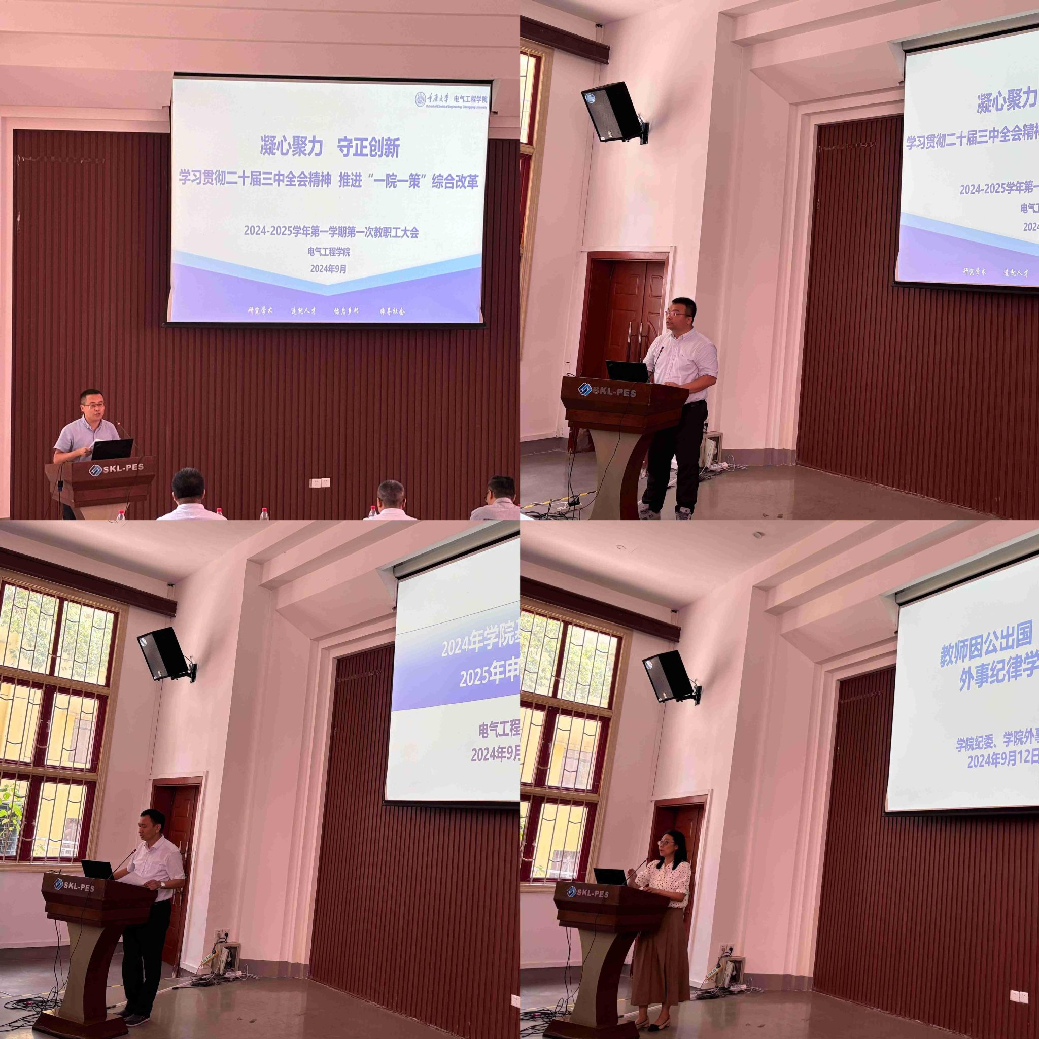 在六教6117报告厅召开2024-2025学年第一学期首次教职工大会。会议介绍了本年度新进教师,传达了学校最新精神并通报部署了学院新学期工作安排等。学院党委书记胡建林,院长谢开贵,党委副书记王晓静,副院长杜雄、杨鸣、王强钢,输变电装备技术全国重点实验室副主任李辉、曾礼强出席会议。大会由王晓静副书记主持。