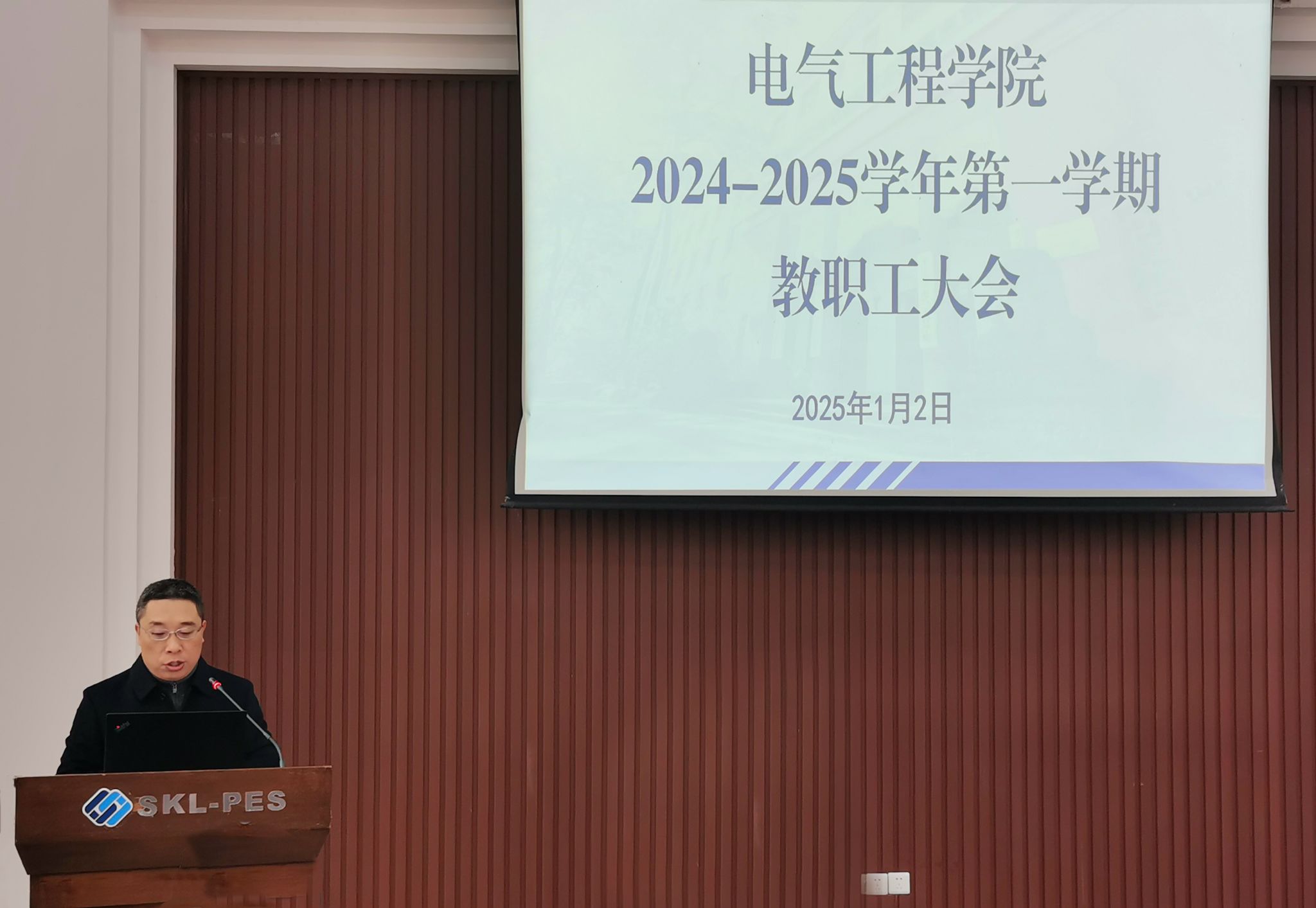 在六教117报告厅召开2024-2025学年第一学期第二次全体教职工大会。本次大会共分为学院领导班子及领导人员述职和学院近期工作通报两部分。校党委组织部副部长彭守建,综合办公室张海鸥,学院党委书记胡建林,院长谢开贵,党委副书记王晓静、吴嘉,副院长杜雄、杨鸣、王强钢,输变电装备技术全国重点实验室副主任李辉、曾礼强,国家野外科学观测研究站专职副站长张志劲出席会议。大会由胡建林书记主持。