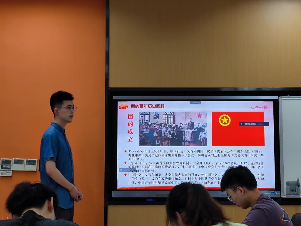 本科生三支部于2022年5月25日下午15时在A8110举行了“纪念中国共产主义青年团成立100周年”主题党日活动,并召开了党支部大会。本次党日活动由孙嘉琛同志讲解中国共产主义共青团相关内容,随后由刘鑫同志主持预备党员转正议程。