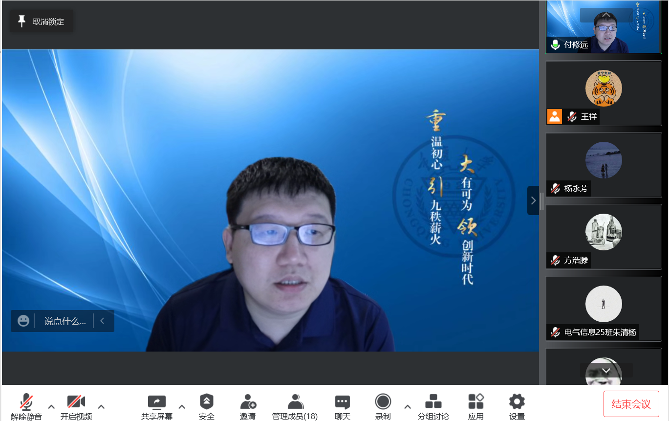 新生十佳班级”评选活动决赛培训在腾讯会议举办。本次培训邀请到党委学生工作部付修远老师和材料科学与工程学院任超老师,两位老师有着丰富的大赛组织和指导经验,对班级建设的理解新颖独到,富有指导意义。