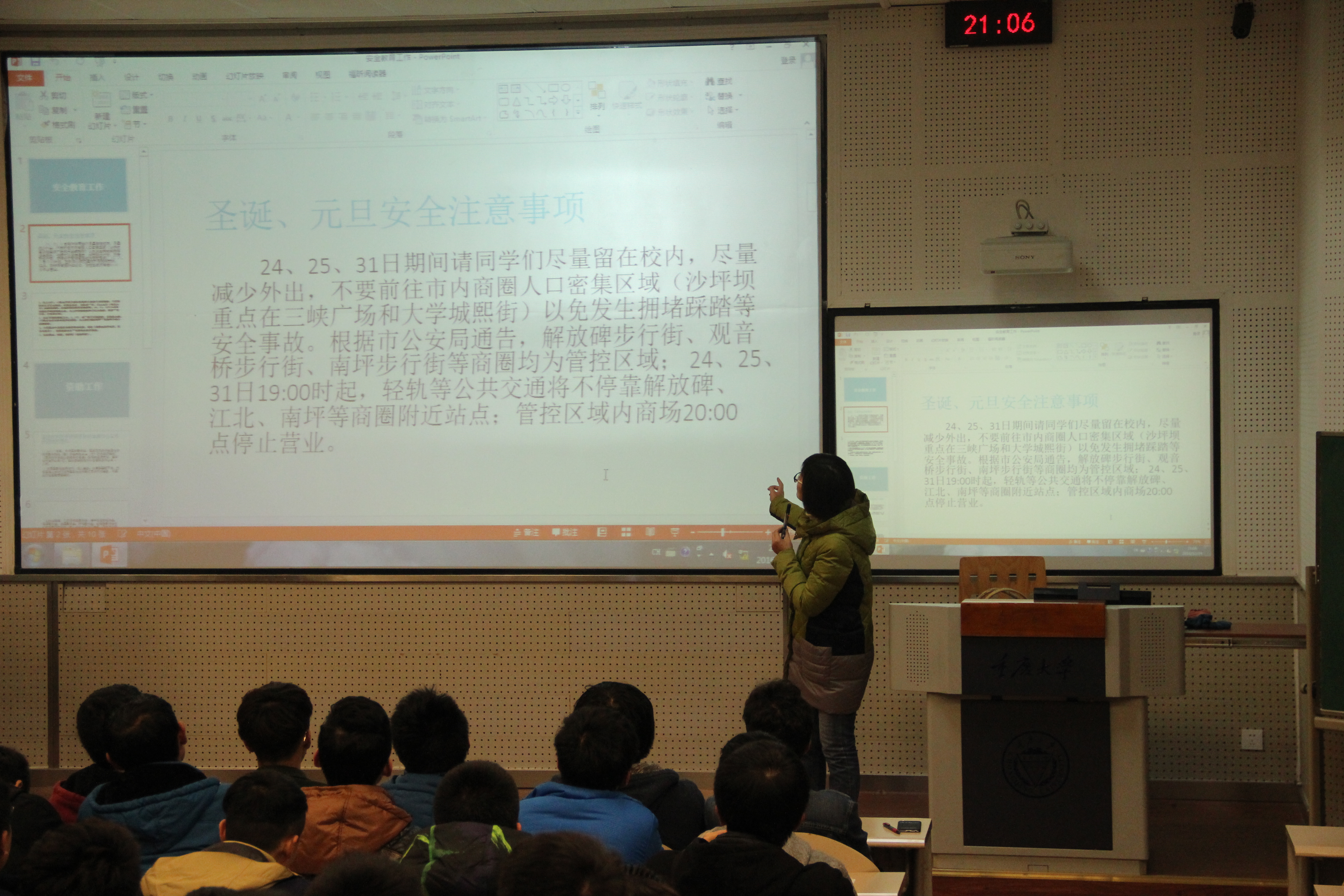 随后,罗老师针对安全工作进行了教育和部署,提醒同学们在圣诞、元旦节期间尽量避免到人群聚集的地方,牢固树立“生命第一,安全第一”的思想,凡是在这期间晚上不在学校住宿的必须书面写请假条,辅导员批准后才能走,如果发生不假离校,进行通报批评和取消评奖评优评助的资格。另外具体讲解了“黄色动漫