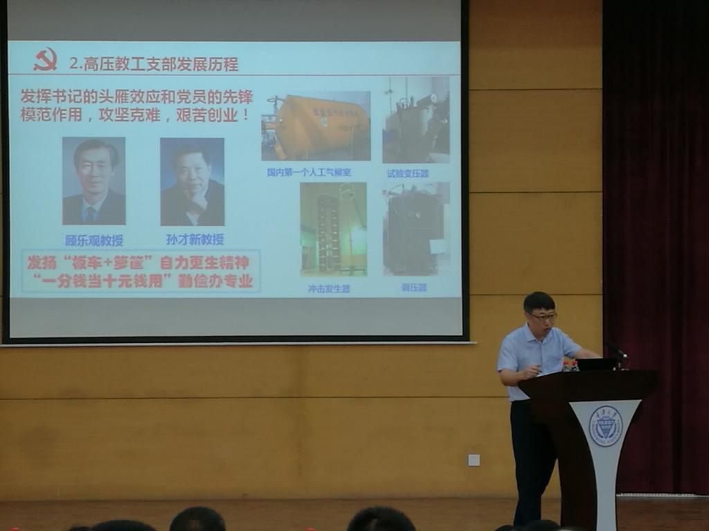 2019年4月25日下午,高电压与绝缘技术系教工党支部书记姚陈果老师在黄色动漫 党建“双创”工作经验交流推进会上发言,向全校教工党支部书记介绍高电压与绝缘技术系教工党支部全国党建工作样板支部建设情况。